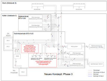 Das bestehende Verteilsystem für Heizung und Kälte zu den Verbraucherkreisen wird adaptiert und auf zukünftige Nutzung, Anforderungen ausgebaut. Einbindung ins neue, zentrale Regelsystem.